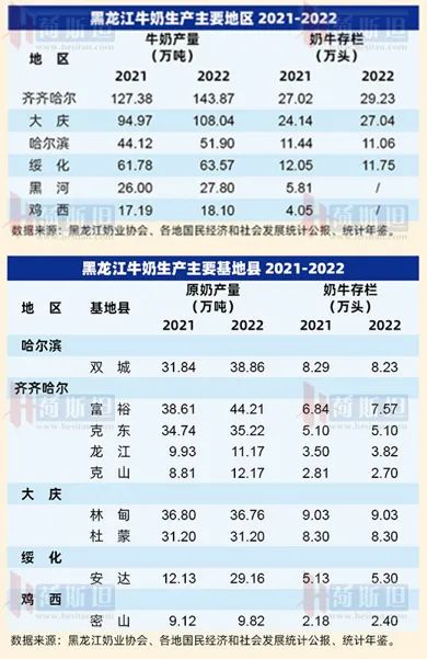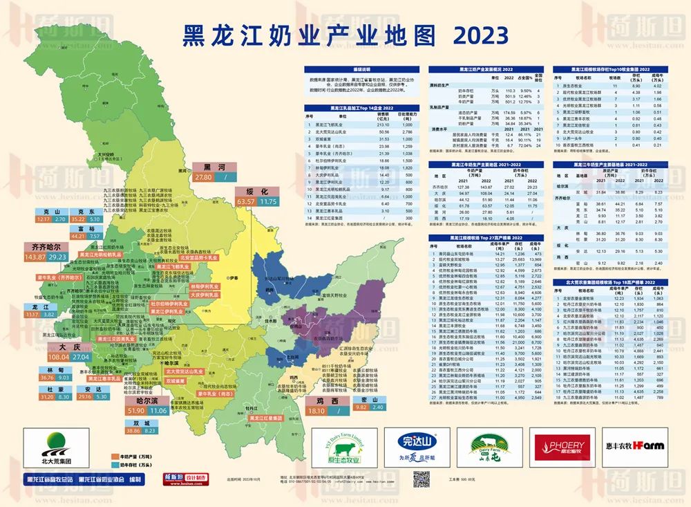 《黑龍江奶業產業地圖2023》由黑龍江省畜牧總站和黑龍江省奶業協會編制,展示了黑龍江奶業產業發展概況,黑龍江奶類產量501.9萬噸,居全國第三位,其中牛奶產量501.2萬噸,居全國第三位,奶牛存欄110.3萬頭,居全國第四位。產業地圖上標注了牛奶生產主要的15個縣(區、市)及黑龍江地區近100家代表性牧場集群和規模牧場。