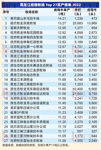 除此之外,《黑龍江奶業產業地圖2023》還以表格的形式呈現了黑龍江乳品加工TOP14企業、黑龍江規模牧場存欄TOP10牧業集團、黑龍江規模牧場TOP27高產榜單及北大荒農墾集團規模牧場TOP18高產榜單。