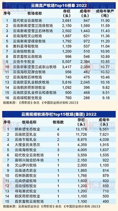 除此之外,《云南奶業產業地圖2023》還以表格的形式呈現了云南乳品加工TOP12企業、云南規模牧場存欄TOP15牧場(集團)、云南高產牧場TOP16榜單、云南奶山羊養殖TOP10基地縣及云南規模化奶山羊&奶水牛養殖場。