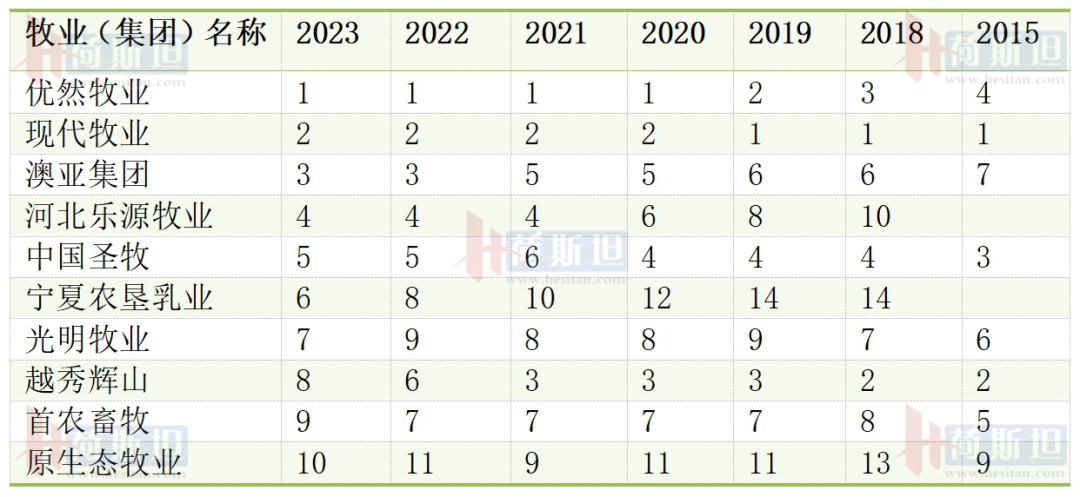 2015-2019年現代牧業一直是全國第一大牧業集團。2020年優然牧業超過現代牧業,成為全國第一大牧業集團,也是全球最大的原料奶供應商。澳亞集團是國內公認養牛技術水平最高的牧業集團,在Top10牧業集團的排名從2015年第7持續上升,2022和2023年穩定在第3的位置。樂源牧業后來居上,從2018年第10名上升到第4,并保持穩定。