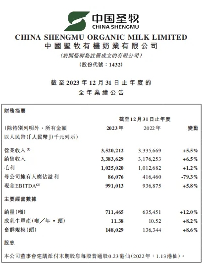 3月26日,中國圣牧發(fā)布截至2023年12月31日止年度的全年業(yè)績(jī),該集團(tuán)期內(nèi)取得銷售收入33.84億元(人民幣,下同),同比增加6.53%;股東應(yīng)占溢利8607.6萬元,同比減少79.33%;每股基本盈利0.0104元;擬派發(fā)末期股息每股0.23港仙(相當(dāng)于人民幣0.21分)。