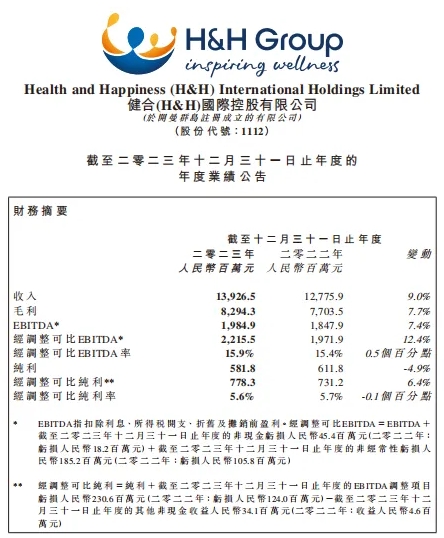 H&H國際控股發(fā)布截至2023年12月31日止年度的年度業(yè)績(jī),該集團(tuán)期內(nèi)取得收入139.26億元,同比增加9.01%;股東應(yīng)占溢利5.82億元,同比減少4.89%;每股基本盈利0.91元;擬派發(fā)末期股息每股0.18港元。