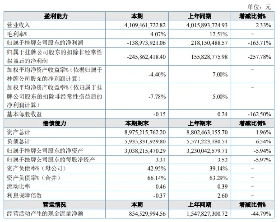 2023年,賽科星實(shí)現(xiàn)營業(yè)收入約41.09億元,同比增長2.33%;實(shí)現(xiàn)歸屬于掛牌公司股東的凈利潤虧損約1.39億元,同比下降163.71%。凈利潤減少主要原因是生鮮乳、生物資產(chǎn)銷售價(jià)格下降導(dǎo)致毛利率下降,銷量增長帶來的營業(yè)收入增加未能完全抵消毛利率下降對(duì)利潤的影響。